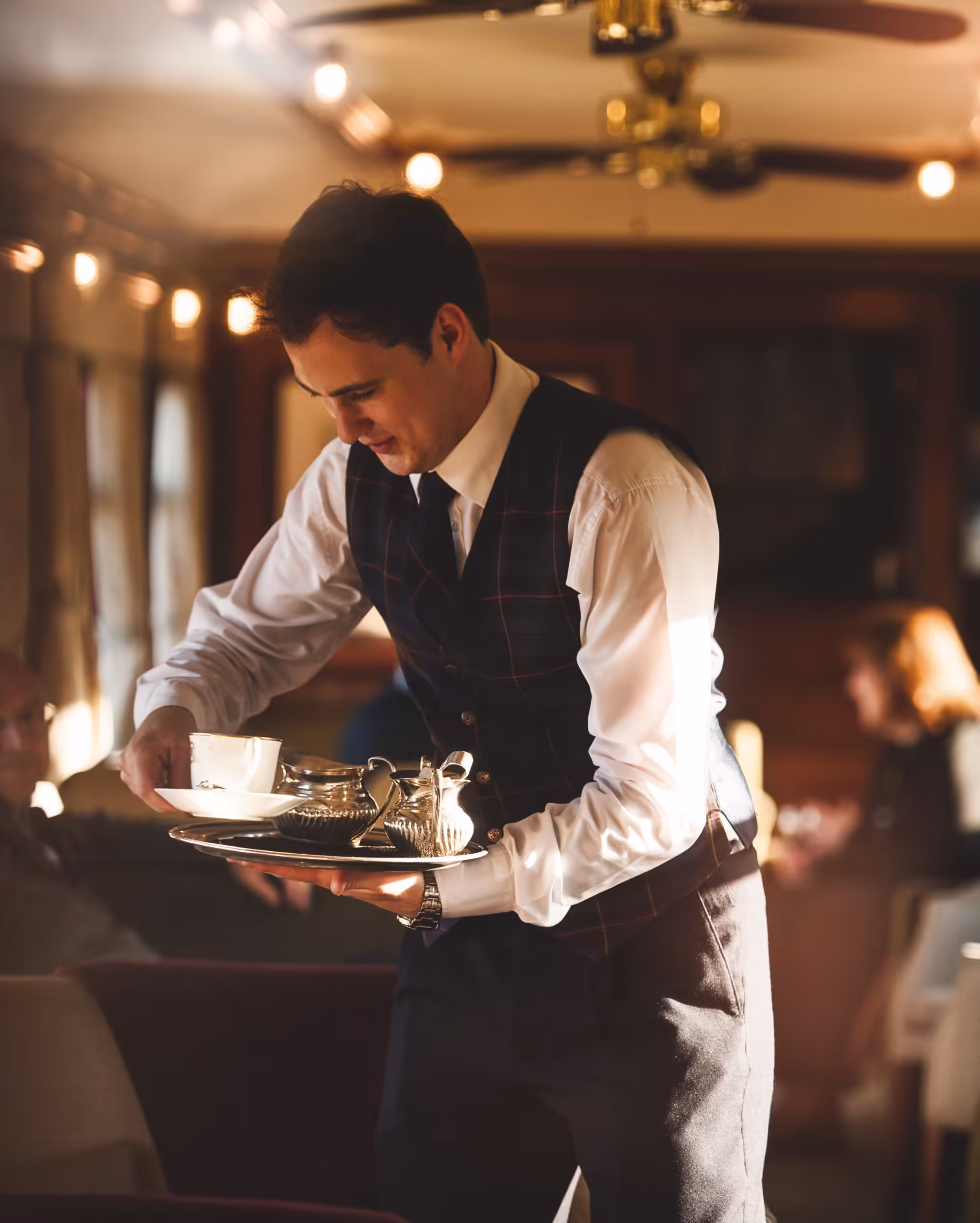 As evening falls, take your seat in the Dining Car. Expect sensational dishes, like warm pigeon salad accompanied by blackcurrant dressing, spiced roast halibut, and sumptuous apple mousse.